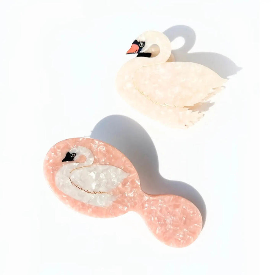 featuring two solar eclipse icons, our compact perfect daily brush + claw clip are designed for detangling + styling on-the-go. hand-painted by our solar eclipse artists, they’re carefully crafted from eco-friendly acetate made from recycled wood pulp. handmade with the finest materials, our luxurious designs will upgrade your routine and are created to be treasured for years to come. our 2-in-1 perfect compact brush is designed for all hair types + textures. featuring two types of bristles, it can be safely used on wet + dry hair. the vegan boar-like bristles are designed to stimulate natural hair growth + evenly distribute natural oils + smooth your hair. the detangling bristles are designed to gently stimulate and massage your scalp + gently detangle wet hair our swan claw clips are hand painted by our Solar Eclipse artists. the claw is double sided, for a perfect look from all angles!