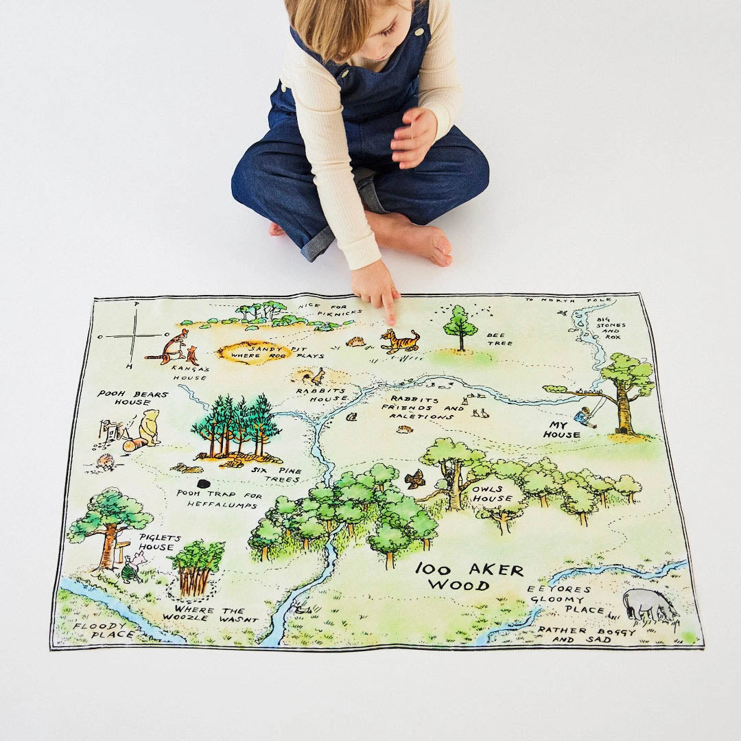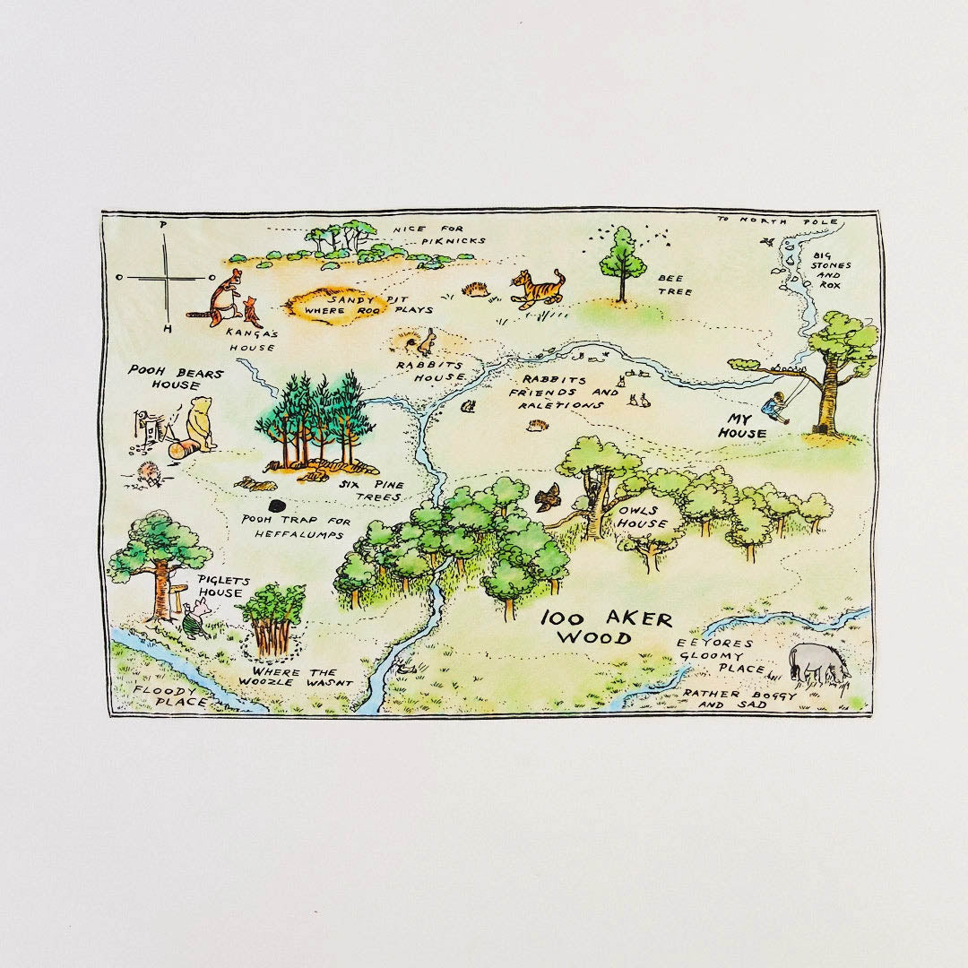 Seek & find familiar places and hidden details throughout the illustrated map of 100 Aker Woods, the beloved fictional setting of the Winnie the Pooh stories, featuring characters like Pooh, Piglet, Eeyore, and friends.