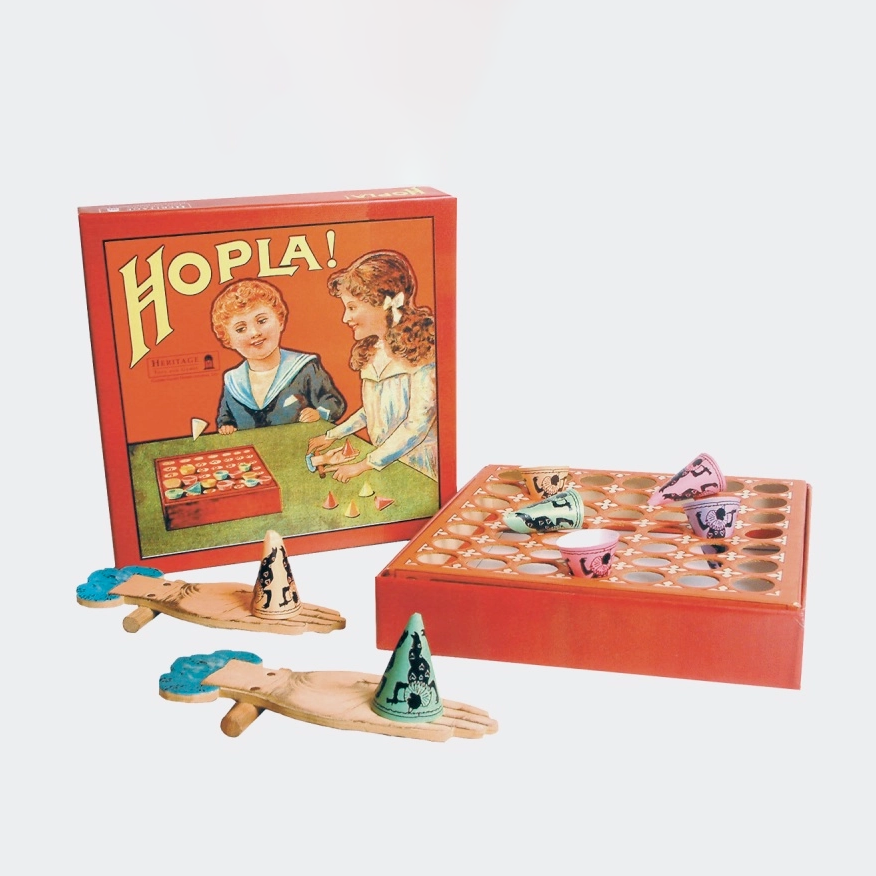 HOPLA A game which requires a steady hand and a keen eye. Use the wooden hands to flick the cones on to the scoring net. Beautifully packaged based on a design from the 1890's. Recommended age 4+ Box size 8.3” x 8.3” x 1.5”