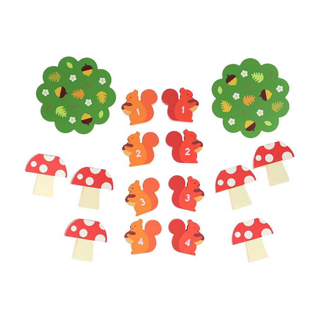 Perfect for 2 players—or more if you play in teams—and ages 4 and up, this game includes 8 wooden squirrel counters, 6 wooden mushroom stands, 6 flight tokens, 2 wooden nesting tree bases, and English, Dutch, French, German, Italian, and Spanish instructions.