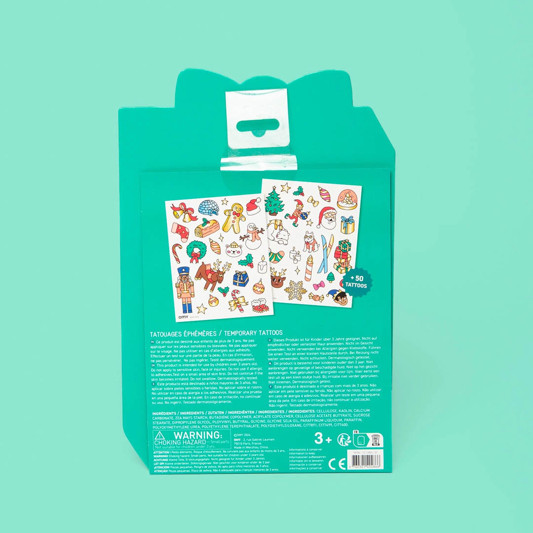 50 Fluorescent & Gold Christmas Tattoos – Perfect for under the tree! Give kids a magical and creative moment with this sheet of 50 temporary tattoos in bright neon colors with shiny gold accents. All about Christmas fun—featuring silly reindeer, sparkling trees, and tons of wintery surprises to stick on their skin! Easy to apply and dermatologically tested, these tattoos are safe and fun for holiday celebrations. A perfect little gift for Advent calendars or holiday parties! From age 3