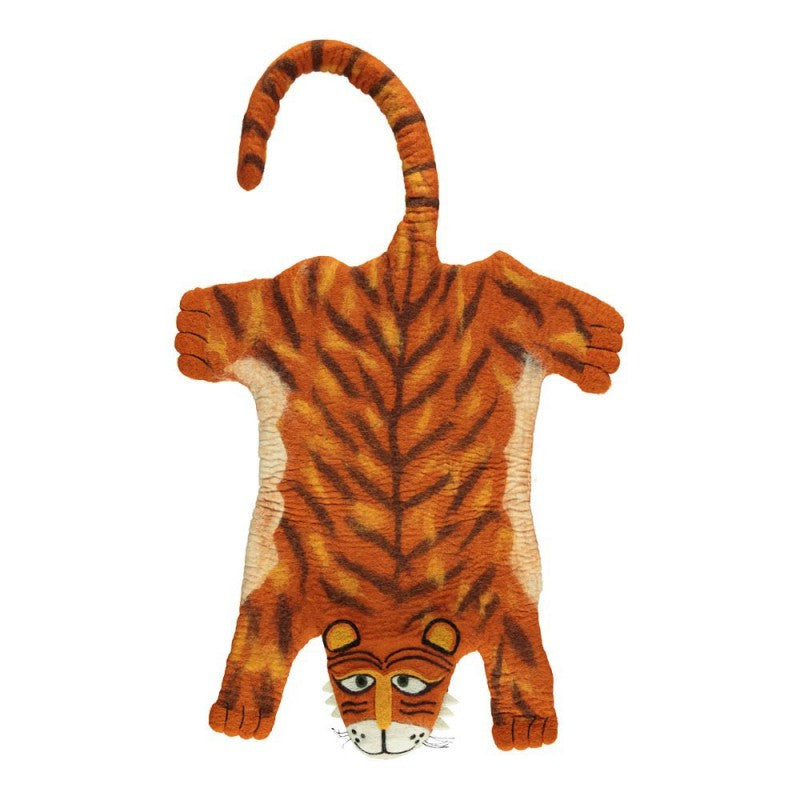 Hand Felt rugs are skillfully created by shaping organic wool with soap, water and hand pressure. Fine needle felted details bring the charming Tiger to life!