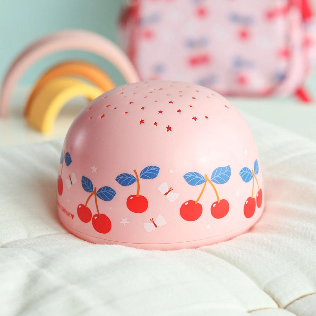 This magical cherries projector light shines stars onto the walls and ceiling. You can easily switch between different star colors with the touch of a button: rainbow, orange, green, or blue. When set to the timer function, the projector light turns off automatically after 30 minutes. Your little one can fall asleep underneath a lovely starry sky.