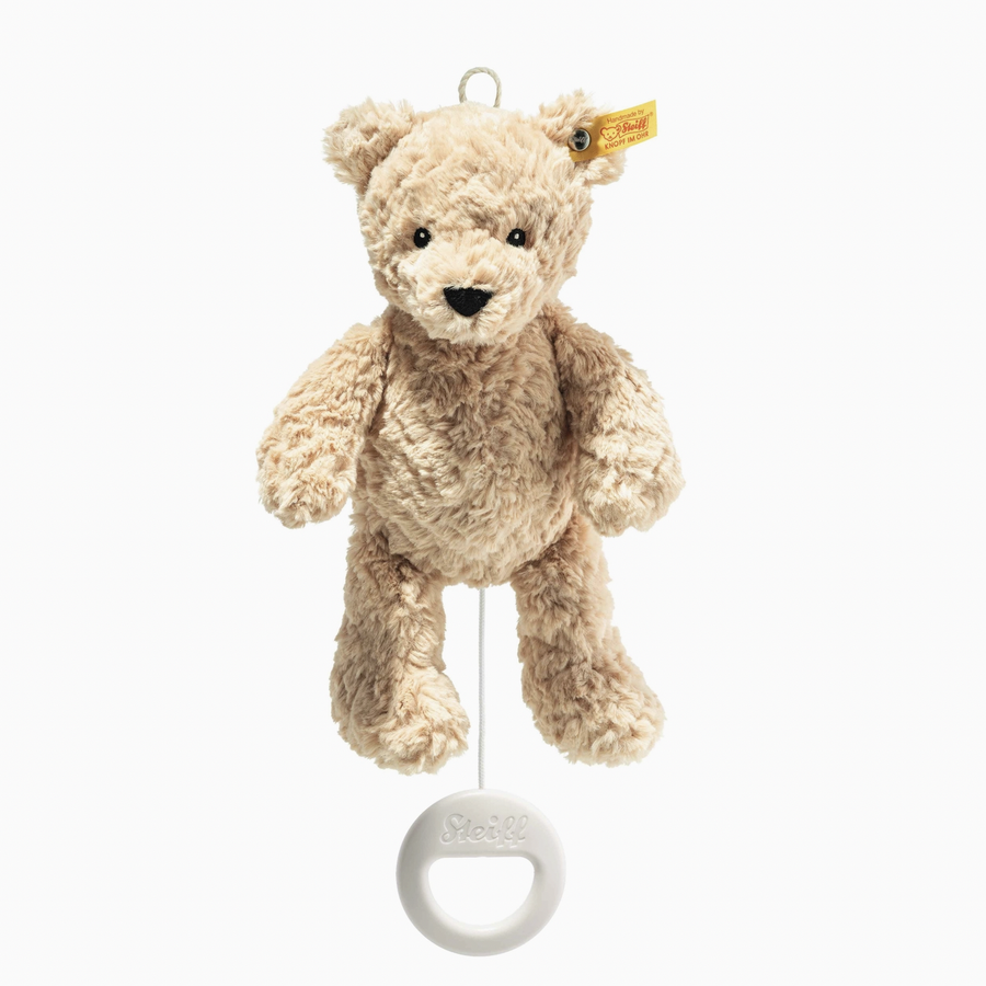 Jimmy, one of our most popular teddy bear designs for children, now comes in styles that are designed with babies in mind. Pull the string on our musical version of Jimmy, and baby will hear a soothing lullaby. Jimmy Teddy bear musical pull toy attaches easily to a crib, and has been safety tested for ages 0 and up. Sewn from luxuriously soft blonde plush, Jimmy is the perfect baby shower gift for any infant.