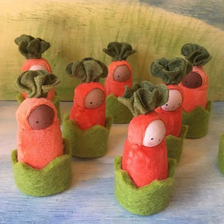 Made from 100% wool felt hand sewn. The seedlings are just 1-1/2" tall, made from velour, and a wooden form under cotton knit fabric. Their faces are hand drawn with permanent ink.