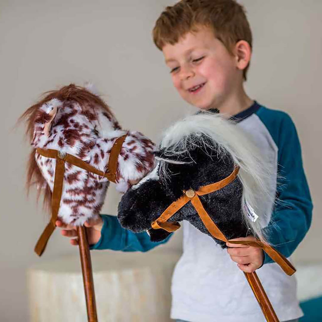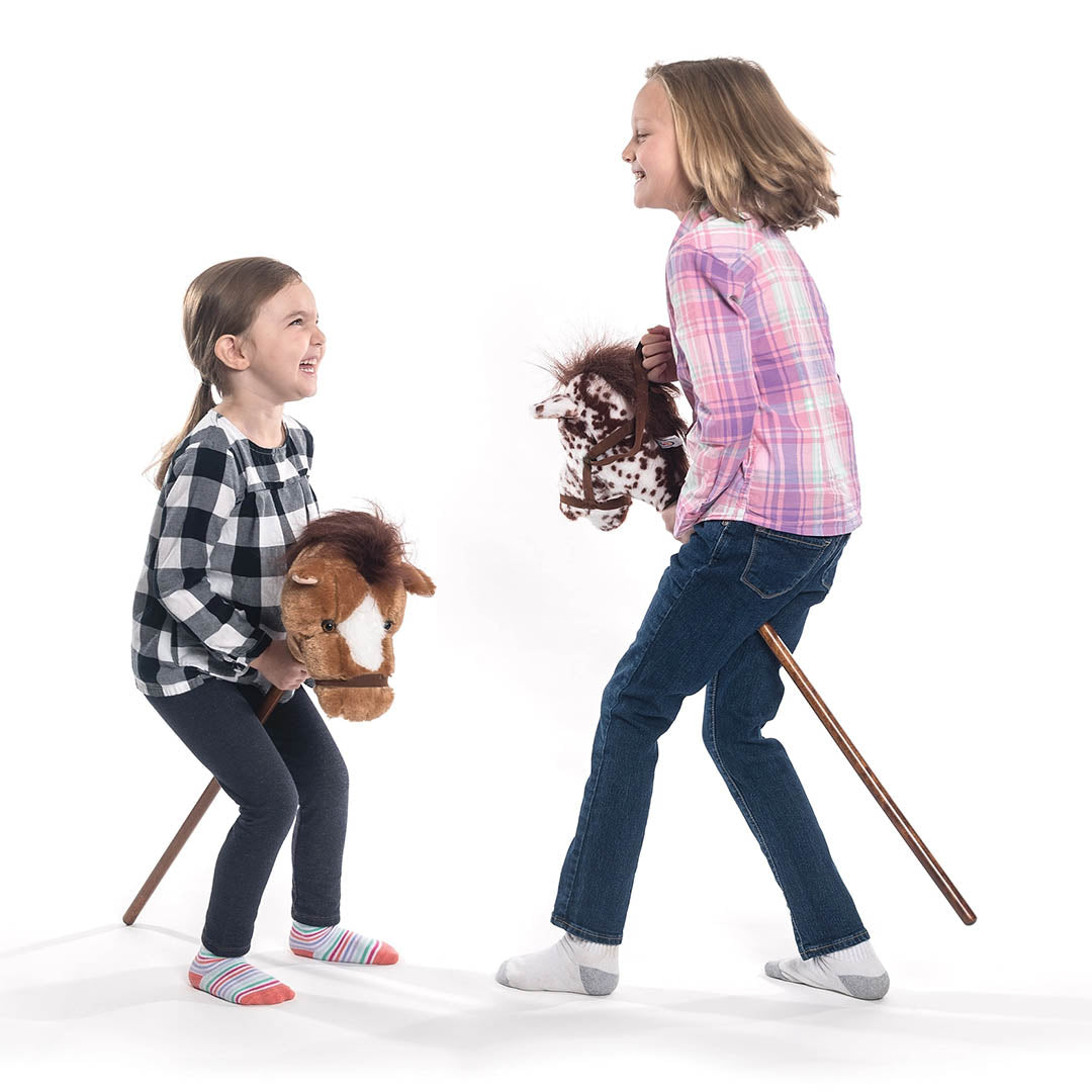 Stick horses have been amongst our most popular toys since Mary Meyer introduced them in 1963. Chosen by the Toy Industry Association as one of its “Toys of the 20th Century”. Kids have a blast making believe they’re in the saddle; great for playtime or as part of a costume. Brown with white trim and measuring 33" from the bottom of the stick to the tip of the head, this stick horse neighs and gallops when you press the right ear. Surface wash; soft toy made to strict quality standards to meet or exceed US Safety requirements.