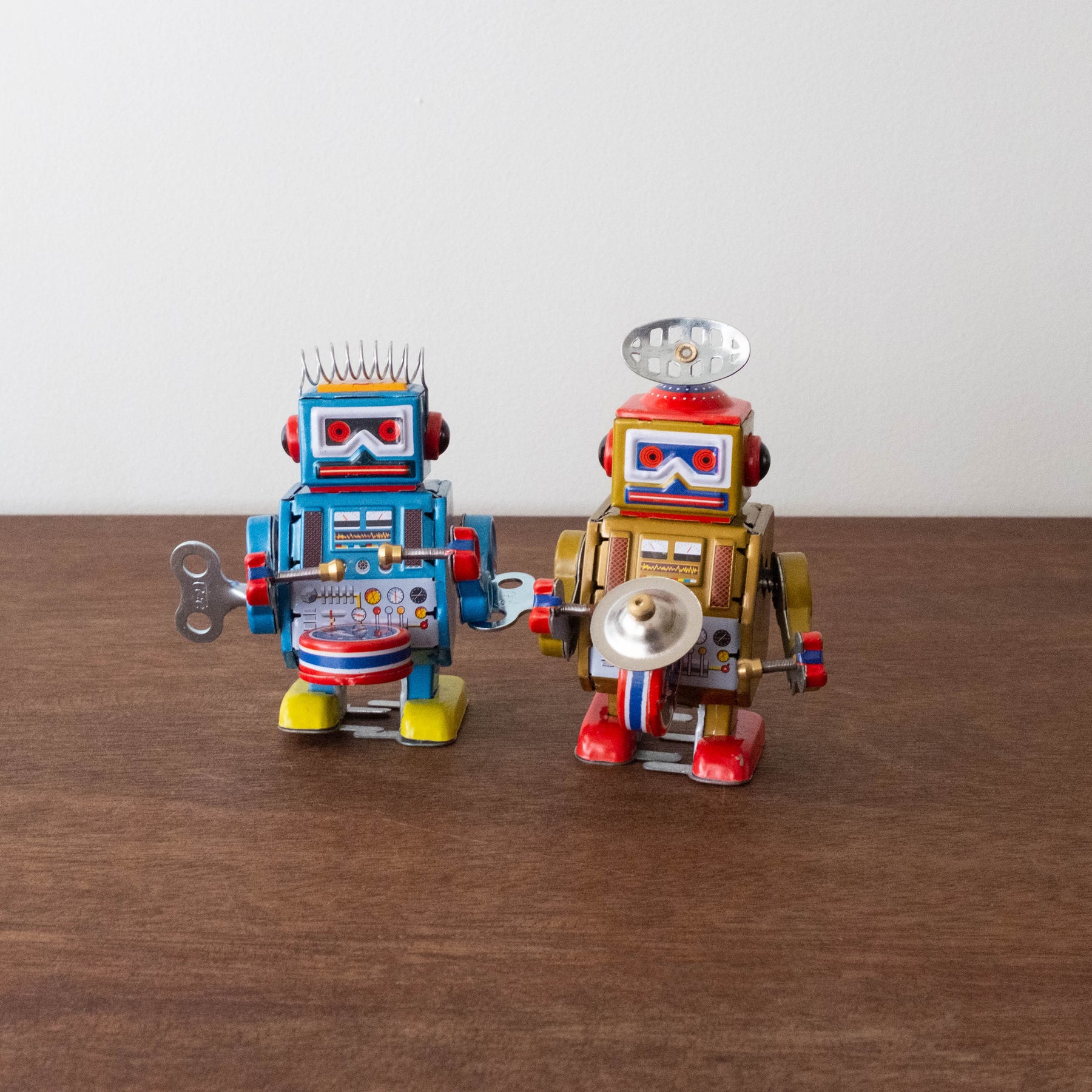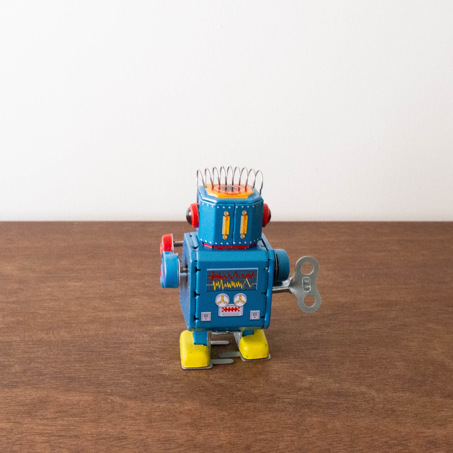 This small blue robot is driven by a wind-up mechanism, which is operated by the included key. Once wound up, the robot starts and hits the drum at the same time as the drumsticks. Small tin toy with great fun. Size: 5.5 x 6.5 x 10 cm