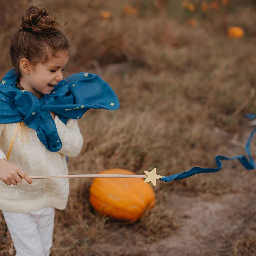 The Star Streamer is a 16-inch long birch wood wand topped with a decorative wooden bead and an 8-foot long x 1-inch wide Star Silk Streamer.