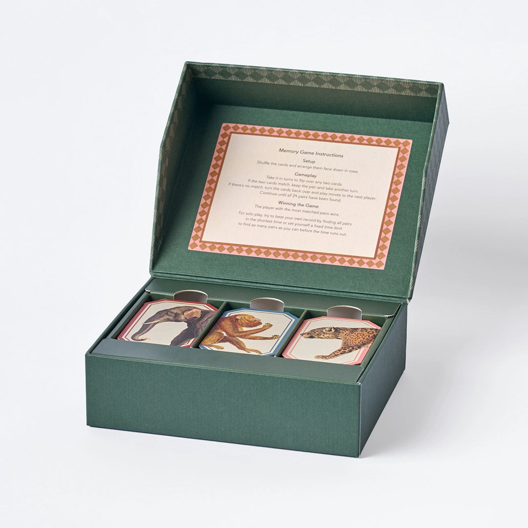 This Animal Kingdom Memory Game includes 24 pairs of shaped cards featuring incredible vintage illustrations of animals of the natural world compiled from antique books. Roomytown's design team in Bath, UK, have carefully adapted and enhanced the original artwork and applied it to each of the playing cards to create this elegant matching game that tests your memory skills. Includes 48 illustrated playing cards (x24 pairs) stored in a premium quality flip-top card-hinged box. H 142mm x W 177mm x D 58mm / H 5.6" W 7.0" x D 2.0"