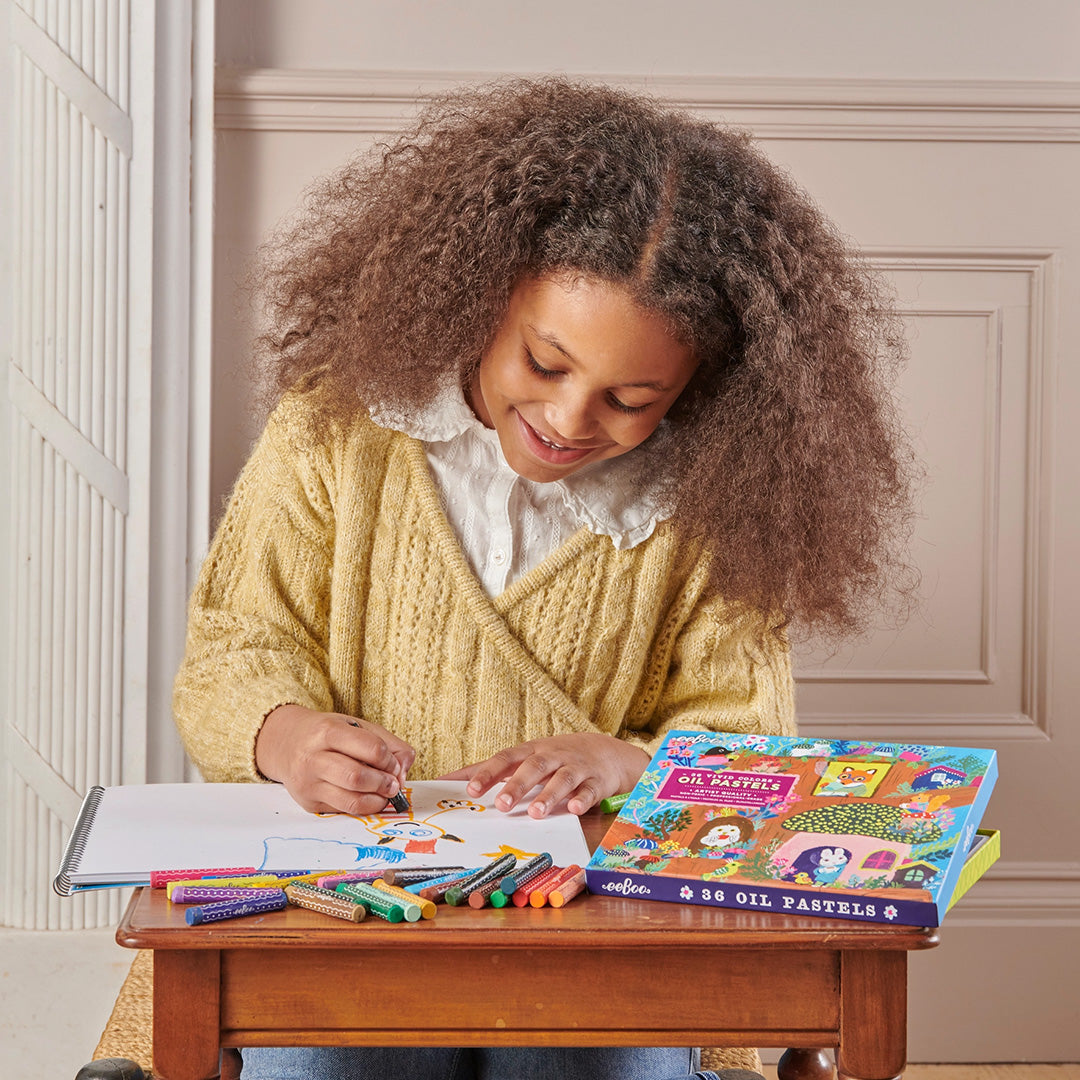 Artist-quality oil pastel sticks in a brilliant array of 50 fade-resistant, long-lasting colors. Packaged in a sturdy, sliding box featuring a fanciful forest dwelling by Yumi Kitagishi. Soft-touch feel and easy to blend, giving depth and subtlety to artwork on paper, canvas, or board. Pairs perfectly with Yumi’s Mushroom House Sketchbook.