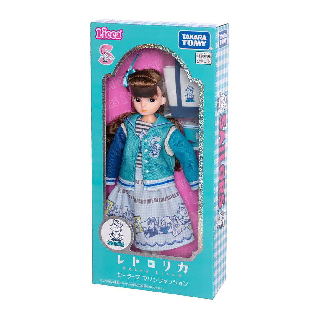 Retro Licca is dressed in a marine outfit featuring the Sailors' popular special color varsity jacket, a gingham check skirt with scattered characters, and a striped top with the Sailors logo underneath. Her hairstyle is a side ponytail with a shag, tied back with the same mint green ribbon as the varsity jacket. She comes with socks, shoes, and a Sailors-themed tote bag.