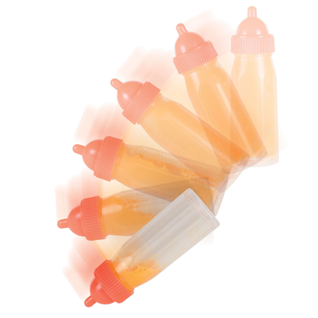 Colorful liquid disappears when tilted for feeding baby. Bottles refill when bottle is stood straight again. Liquid looks like milk or orange juice, choose from 2 styles. Milk bottle is 4.75 inches tall. Orange juice bottle is 4 inches tall. Made with high-quality, nontoxic plastic and featuring lifelike designs and mL markings.