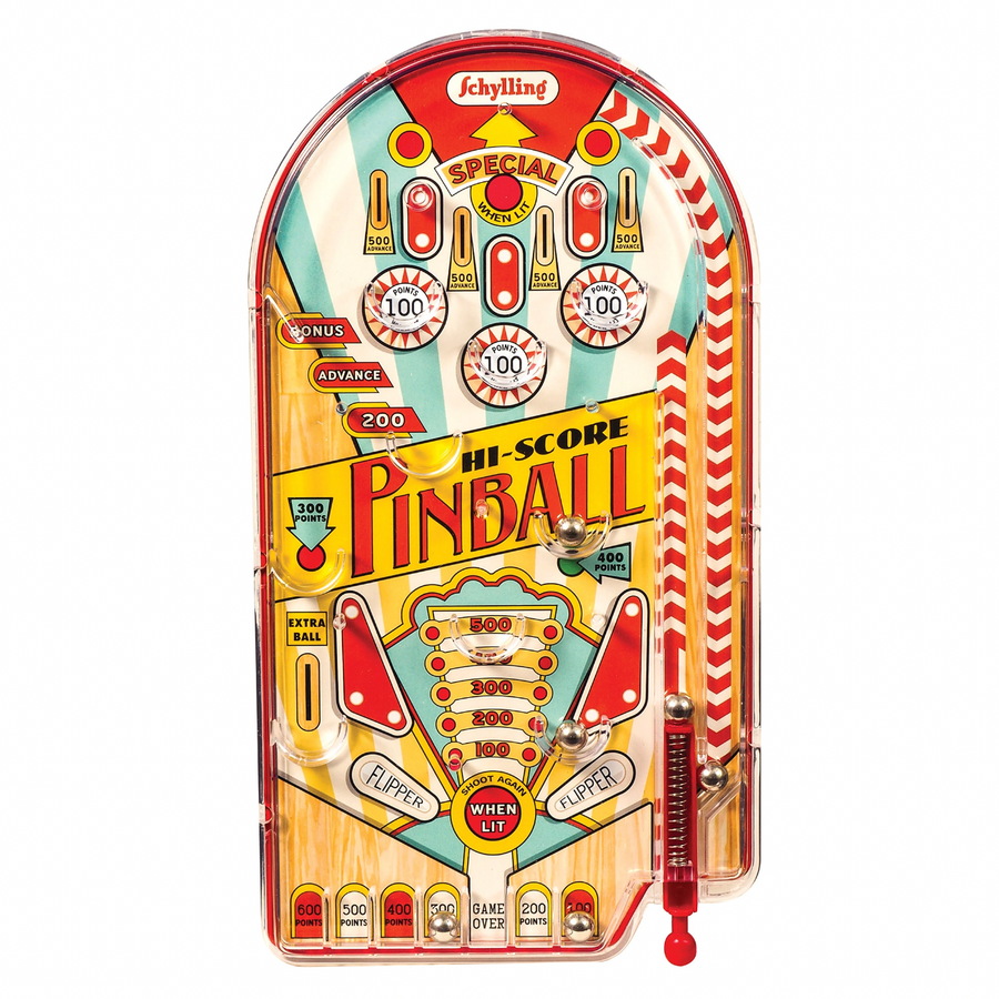 Pull back the lever and fire away; Hi-Score Pinball is simple handheld entertainment. Beautifully printed tin base, inspired by classic, vintage pinball graphics. it’s just perfect for travel and rainy days