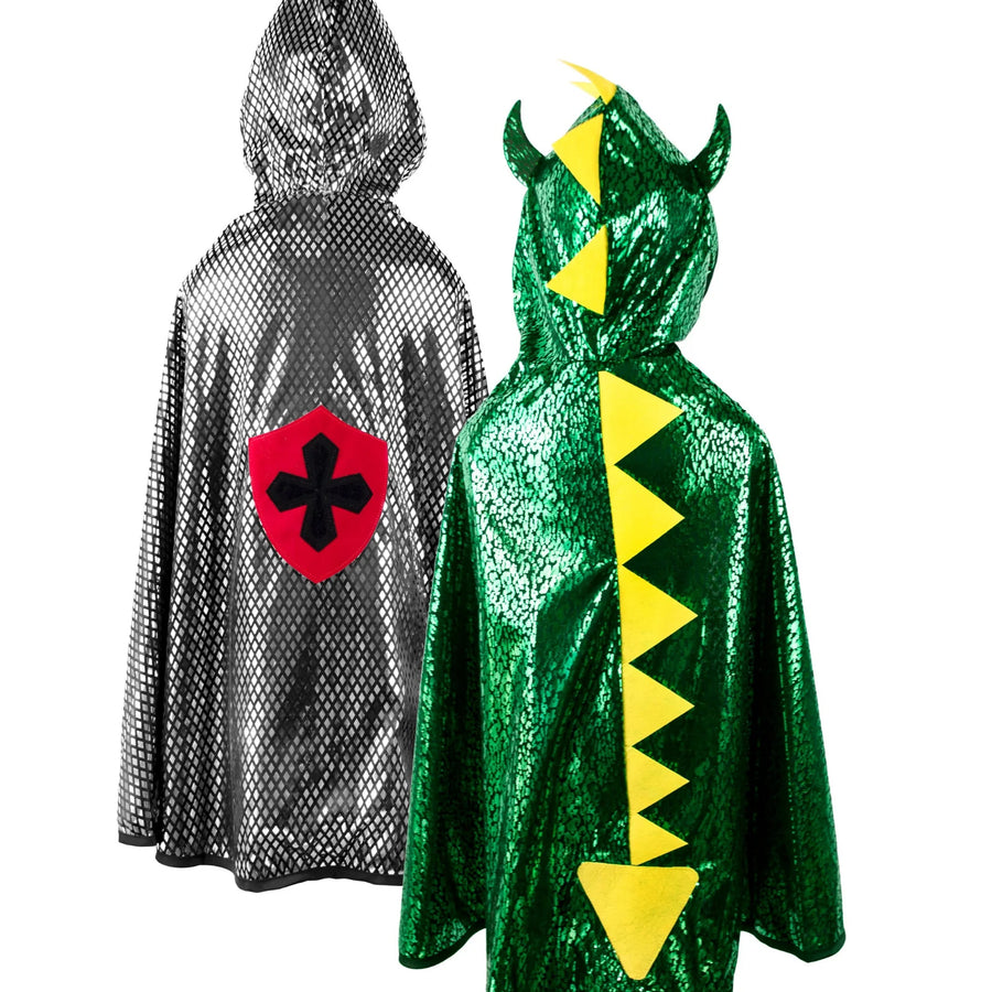 Whether you are fighting dragons or being the dragon, this reversible cape offers plenty of enchanted fun for everyone. You can pick from two characters with this liquid knit, shiny green side for the dragon in you, and a shiny silver shield emblem on the other side for the Knight in you. The Velcro closure at the neck makes switching medieval characters a breeze.