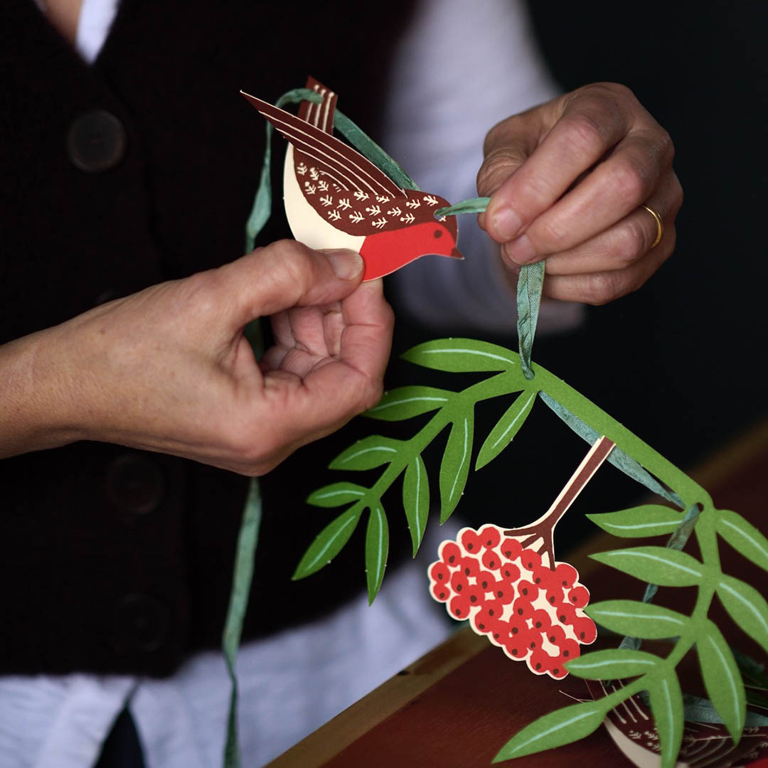 Six sprigs of rowan leaves and berries, and eight very charming robins contained in a self-closing card wallet for long term storage. Pop out and string together on yarn or ribbon of your choice.