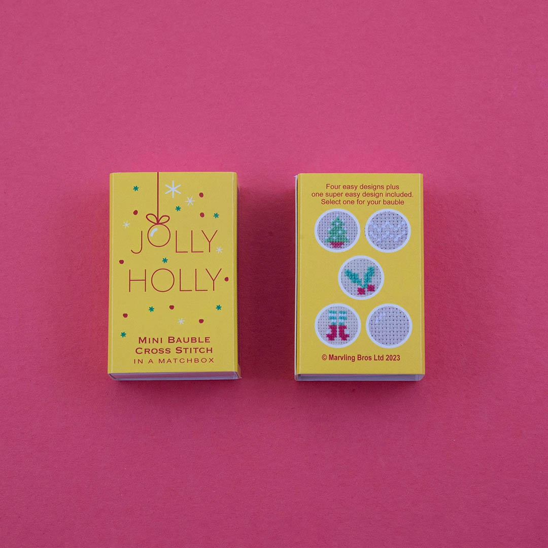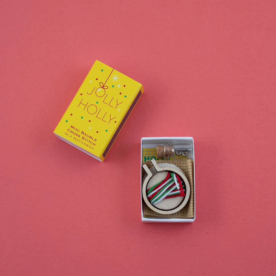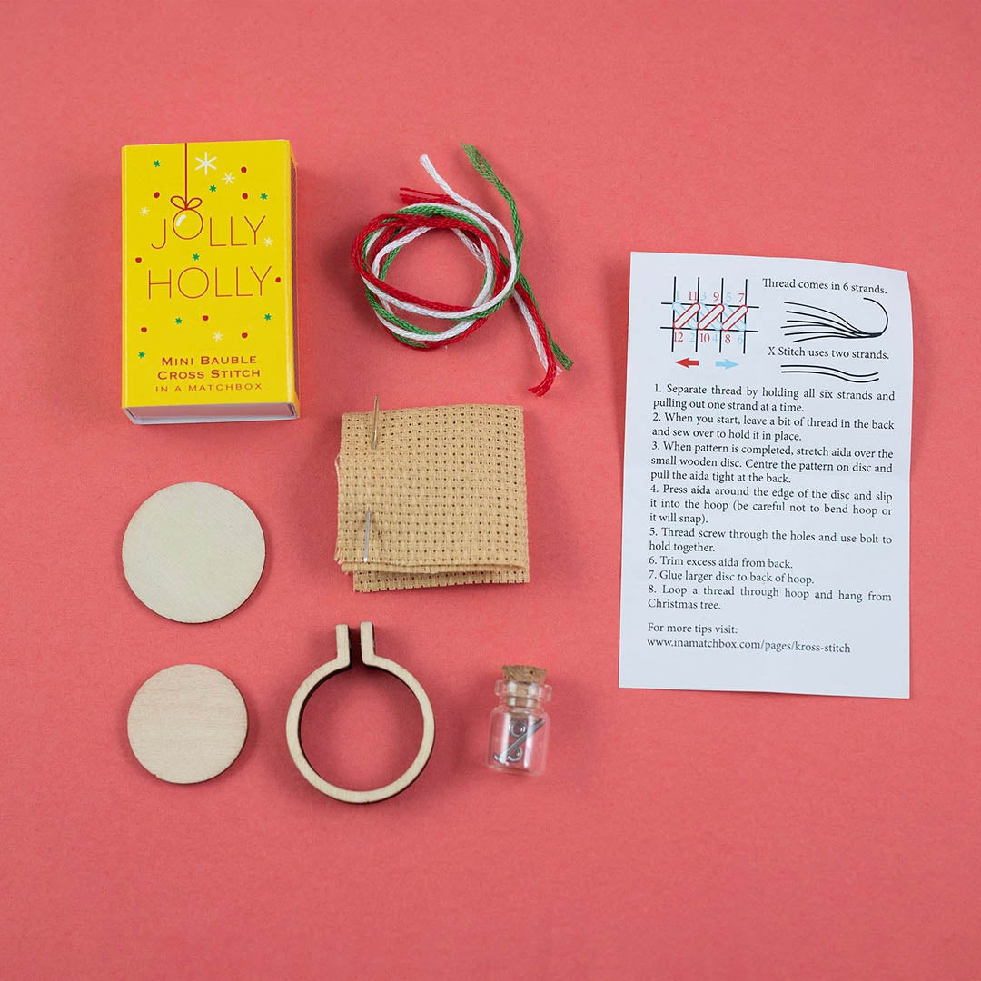 Mini cross stitch kit to make a Christmas bauble with four festive designs packed in a tiny matchbox. Whether you choose the easy snow pattern, the cute reindeer, jolly Santa, Christmas stocking or just the five stitches to make a 'shine' on your 'bauble', all the designs will fit exactly into the mini hoop provided which you can hang on the Christmas tree to showcase your design. This mini cross stitch kit is sure to delight for beginners or experts alike, with aida, needle, threads and even a mini wooden hoop plus full instructions for Christmas designs. The perfect gift for a cross stitch lover and a lovely introduction to this much loved past-time. This matchbox fits through a standard letterbox.