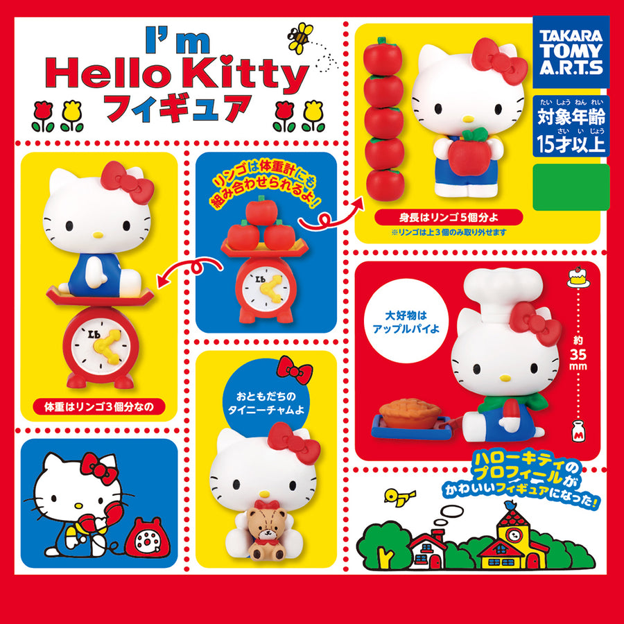 All about Hello Kitty! One of four figurines, which include Hello Kitty on a scale, Hello Kitty with five apples to match her height, Hello Kitty with her favorite apple pie, and Hello Kitty with her friend Tiny Charm.