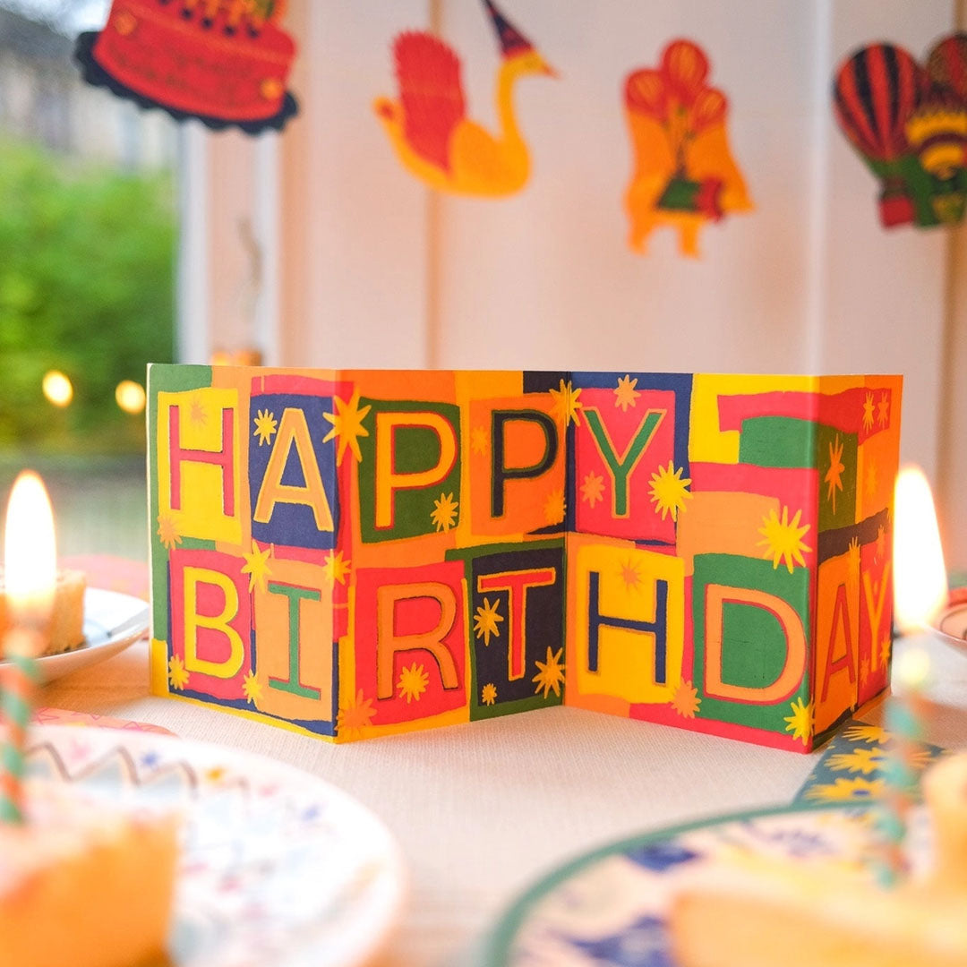 This vibrant concertina card unfolds with a burst of color to reveal a cheerful Happy Birthday message with blank reverse for personalized message.