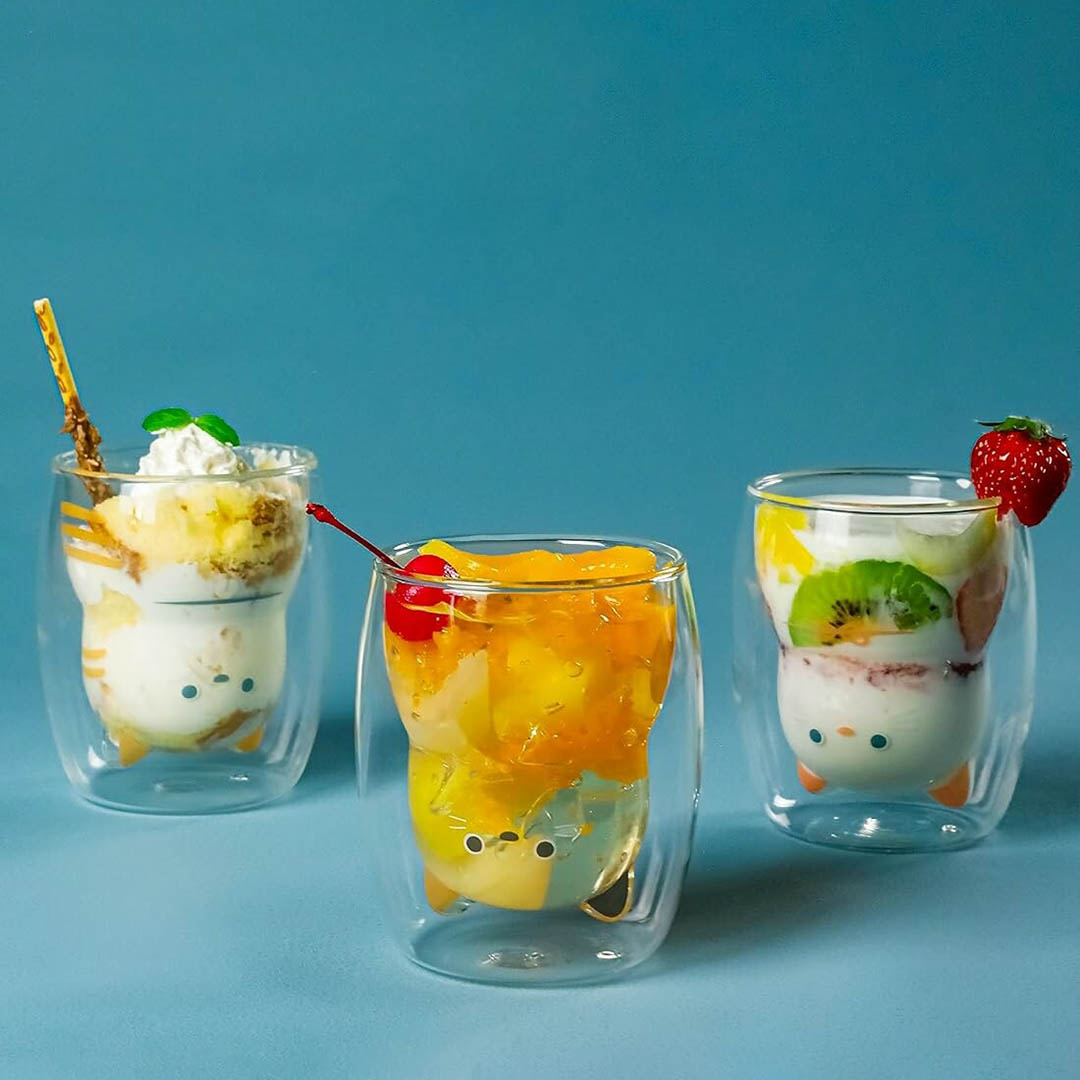 The two-layered heat-resistant cat glass changes the appearance of the cat depending on the beverage you pour into it.