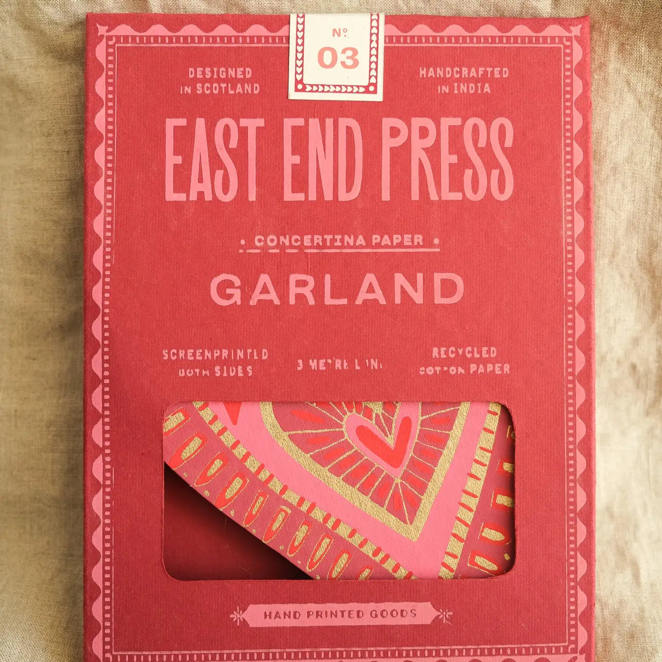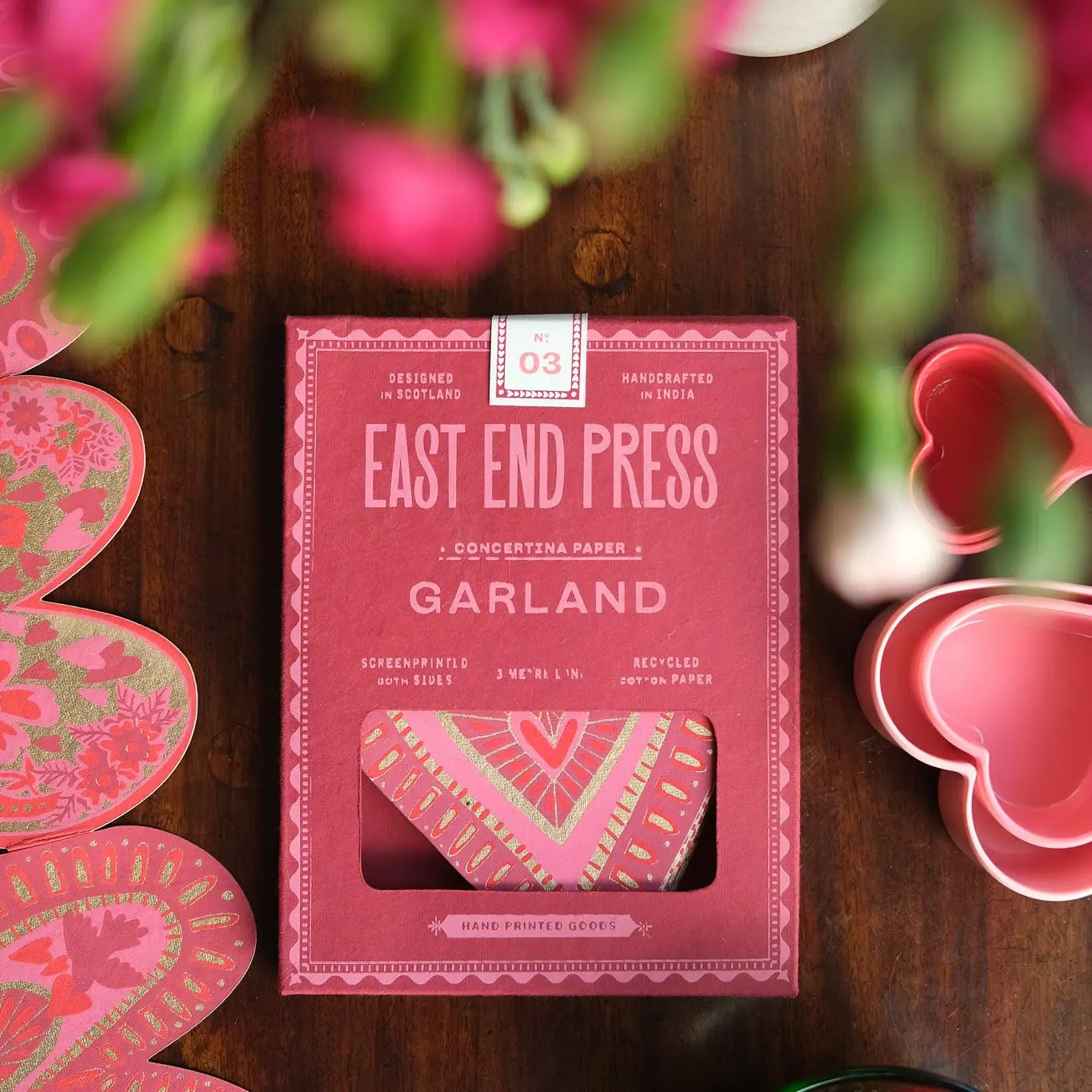 Love is in the air with our sweet collection of hearts, each adorned with bursts of pastel pink, ruby red, and flourishes of metallic gold. - 3 metres long - 4 designs repeating over 20 shapes, make up each concertina. - Screen printed by hand on both sides by talented artisans in Jaipur - Sustainably made from recycled materials
