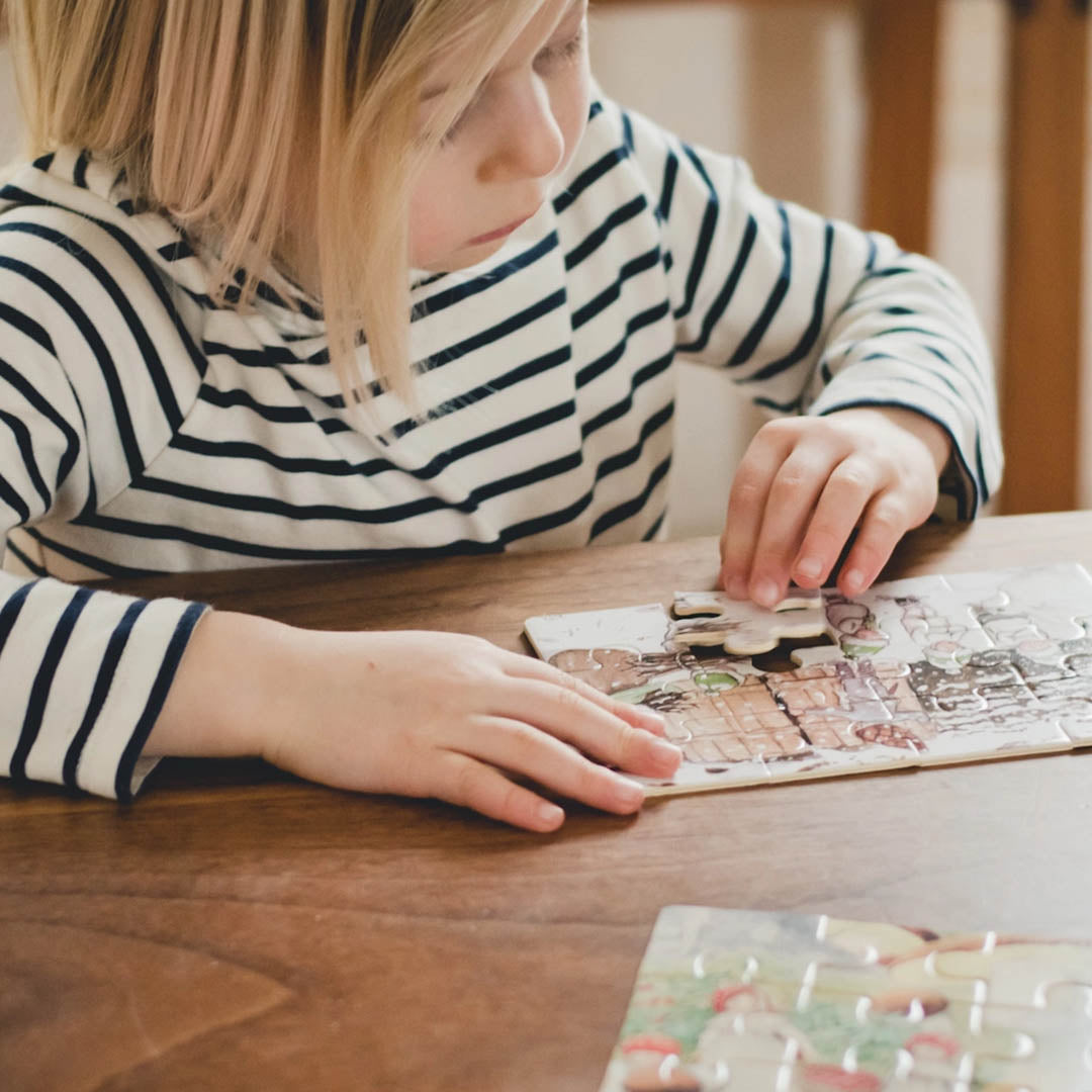 Four puzzles featuring scenes from Elsa Beskow’s Children of the Forest (Tomtebobarnen) children's books. Elsa Beskow was a Swedish children's book writer and illustrator and very popular among Waldorf school families. Each puzzle contains 12 pieces. The four puzzles come in a wooden box with a wooden, sliding lid.