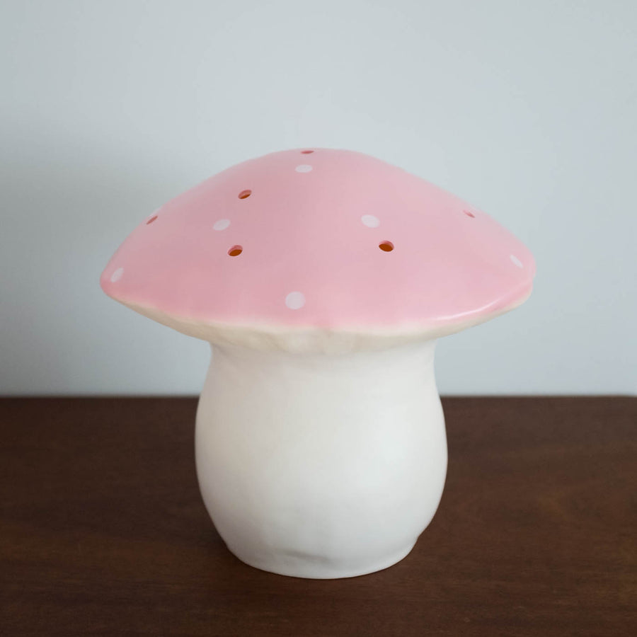 With the night light Large Mushroom Pink, a whole dream world opens up! The night light gives a very soft and veiled light and will help the little ones to fall asleep without fuss. Lighted or not, the mushroom is always a nice decorative object.Traditionally made. For the safety of the kids, supplied with LED system of 6 W.